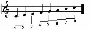 Here we have broken the scale into eight intervals for you to visually see the steps. If you were to write out an exercise in which you use the first note of the scale to be the first note of the measure, followed by the 2nd note of the scale, then the third, and then the fourth, and so on, (see Figure 2b), you would be able to recognize the different steps between notes on a scale.