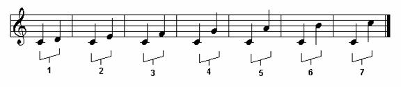 In the Figure 2b, each measure starts with the same note, C. It is the first step. Looking at interval 1 the step is called a second because it starts on the first step, (C), and goes to the second step, (D).