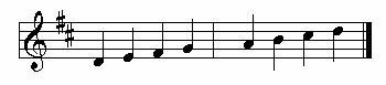 Take a look at Figure B. It is the D Major scale in Treble clef. We know it is the D major scale because of the accidentals at the beginning of the staff. The D major scale is marked by two accidentals - the sharp accidental placed on the space for the C note, and sharp accidental on the space for the F note.