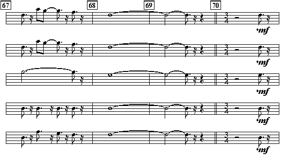 - What is the duration of the dotted quarter note in measure 70?