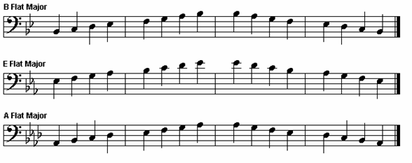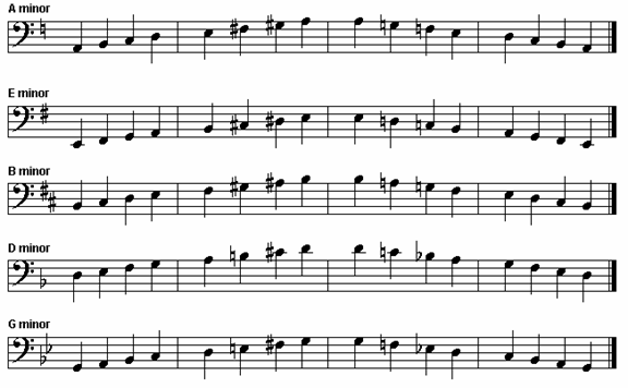 These are fourteen of the most commonly used scales. Pay very close attention to the accidentals for ascending and descending order. There are many more scales, (chromatic, harmonic minor, etc), that are important; however we highly recommend that you familiarize yourself with these first.